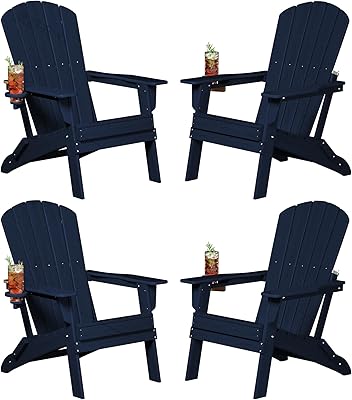 Plawdlik Folding Adirondack Chair, SGS Tested, Wooden Textured with Cup Holder, Heavy All-Weather HDPE Comfortable Set Poolside Backyard Lawn Navy Blue Set 4